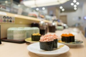 ▶サーモンの卵の軍艦=味付けしたご飯を海苔で囲み、サーモンの卵をのせた寿司で、オメガ3、ビタミンB12、ビタミンD、セレンが豊富な栄養価の高い種類だ。
