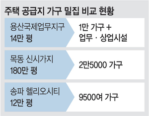 ソウルの主要再開発地域などと比較すると、龍山一帯の過密化への懸念は決して杞憂ではないとの分析だ。龍山国際業務地区は、46万2000㎡(約14万坪)の敷地に1万戸が配置される。一方、陽川区・木洞新市街地は現在、594万㎡(約180万坪)に2万5000戸が入っている。再建築の過程で容積率を高めて戸数を増やしても、3万5000戸程度にとどまる見通しだ。かつて「鶏小屋アパート」論争を招いた松坡区ヘリオシティは、敷地面積41万㎡(約12万4000坪)に9510戸が立地している。