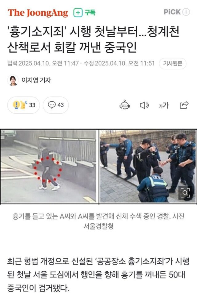 ソウル都心で通行人に向かって刃物を取り出した50代の中国人が検挙された。引用元記事:https://mlbpark.donga.com/mp/b.php?m=search&p=271&b=bullpen&id=202504100102698630&select=spf&query=%EC%82%AC%ED%9A%8C&subselect=&subquery=&user=&site=donga.com&reply=&source=&pos=&sig=h6j6Gf-AghjRKfX2hej9SY-gjhlq