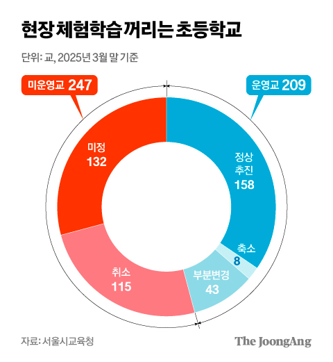 10日、ソウル市教育庁によると、ソウル市内の小学校606校のうち、209校(34.4%)だけが今年「1日型」体験学習を実施予定だという。昨年は478校(78.8%)が実施していた。他の地域も同様の状況で、江原道では体験学習を通常通り実施する小学校は全体の52.4%にとどまる。残りの多くの学校は計画を変更・縮小し、10%は完全に中止した。全国教職員労働組合によると、光州広域市では小学校155校中、89校(57.4%)が体験学習を延期または校内行事に置き換えた。