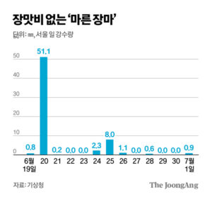 ソウルの場合、最初の梅雨雨が降った先月19~20日には50㎜を超える雨が降ったが、21日から今月1日までに降った雨は合計で13.1㎜に過ぎない。「梅雨が消えた」という声が出る理由だ。