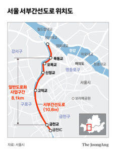 1988年に開通した西部幹線道路は永登浦区・聖山大橋南端から衿川区・衿川ICまで10.6kmを結ぶ往復4~6車線の道路だ。ソウル南西部の主要道路だが「慢性的渋滞道路」と呼ばれる。陽川区・木洞など人口密集地域を通過し、加山デジタル団地など職場の集中地域に向かう車が入り混じるためだ。通行量は1日平均約10万8000台に達する。迂回道路となるべきソウル光明高速道路は現在も工事中だ。