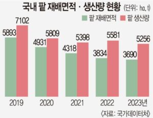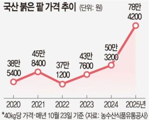 26日、農水産食品流通公社(aT)によると、23日時点で国産赤小豆の中卸価格は40kgあたり78万4200ウォンで、昨年(50万3200ウォン)に比べ約1.6倍上昇した。2020年には38万5400ウォンだった小豆の価格が、5年で2倍以上になった。赤小豆の価格は昨冬、わずか3か月で50万ウォン台から79万6600ウォンまで跳ね上がり、今も下落の兆しを見せていない。小売価格も500gあたり1万3868ウォンで、1年前(1万434ウォン)より33%高くなっている。