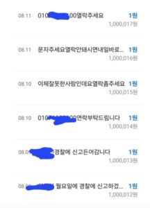実際に「口座凍結」被害に遭った事例を共有した人もいる。それによると、被害者は金曜日の夜、見知らぬ相手から100万ウォンを入金されたという。その後、入金者A氏は被害者に3日間にわたり1ウォンずつ送金しながらメッセージを残し始めた。「月曜日に警察に通報する」「この番号に連絡してください」「メッセージを送らなければすぐ通報する」といった内容だった。