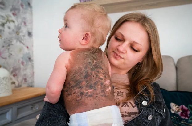 イギリスで、黒い斑点と毛に覆われた状態で生まれた赤ちゃんの話が伝えられました。29日、イギリスのザ・サン紙によると、生後10ヶ月のメイシー・メイちゃんは、「先天性巨大色素性母斑(GCMN)」という良性腫瘍に似た奇形を持って生まれました。GCMNは先天性母斑の中でも非常に大きな高リスク群です。メイシーちゃんの背中全体だけでなく、お腹、腕、脚の上部まで母斑に覆われています。顔と頭皮にも大小100個以上のイボがあります。さらに、最も大きな母斑の上には痛みを伴う病変が7つあり、これらの病変から出血がありました。病院で悪性かどうかを確認するための遺伝子検査などを行った結果、7つの病変のうち1つが癌に発展するリスクが高いことが分かりました。